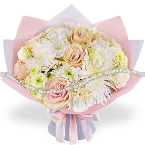 Улыбка весны – букет с кустовыми розами и хризантемами