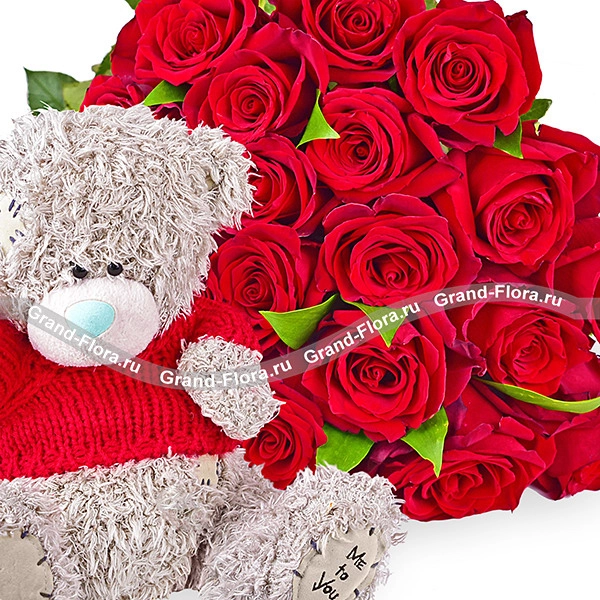 Букет красных роз + плюшевый медведь