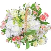 хризантема кустовая белая - 2 шт., роза кустовая белая - 1 шт., роза кустовая розовая - 1 шт., эустома белая - 1 шт., альстромерия белая - 2 шт., декоративная зелень, оазис, корзина малая.
