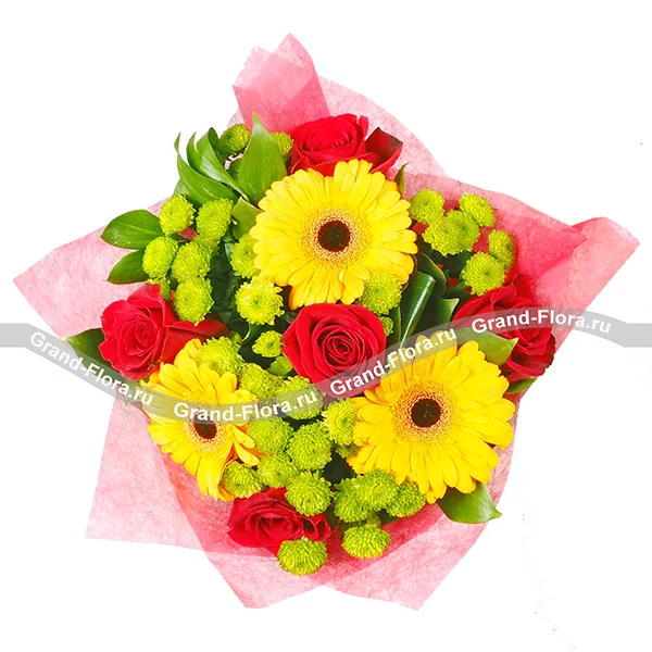 Буйство красок и романтическая нежность герберов, роз и хризантем делают этот букет ярким и запоминающимся. Зеленые хризантемы напоминают о чудесных весенних днях, желтые, как солнце герберы навевают мечты о лете, а красные розы, удачно вписанные в композицию, подводят завершающий итог. Этот великолепный дизайнерский шедевр понравится как молодой, так и замужней женщине.