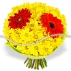 Яркий букет, в центр которого помещена пара огненных гербер, завершает солнечная кустовая хризантема. Такое сочетание цветов вмиг поднимет настроение его получателю. Игривая композиция поможет выразить глубокое чувство привязанности и любви, а также станет великолепным вариантом в качестве подарка значимой женщине в день ее рождения. Ваша мама наверняка запомнит столь очаровательную композицию, а девушка моментально забудет все обиды.