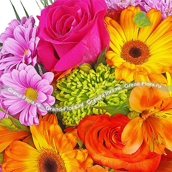Стандартный (на фото): хризантема ромашковая фиолетовая - 6 шт., гербера оранжевая - 3 шт., гербера желтая - 2 шт., роза розовая - 3 шт., роза оранжевая - 2 шт., альстромерия оранжевая - 2 шт, альстромерия розовая - 2 шт., хризантема одноголовая зеленая - 3 шт., лист рабелини - 3 шт., натуральная упаковка розовая, бант в тон.