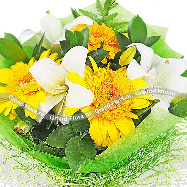 Прекрасная возможность преподнести ранним утром солнечный букет из гербер и благоухающих лилий. Сделайте день запоминающимся просто так - без повода! Или вручите букет в качестве извинения, который будет радовать получателя не меньше 7 дней*.