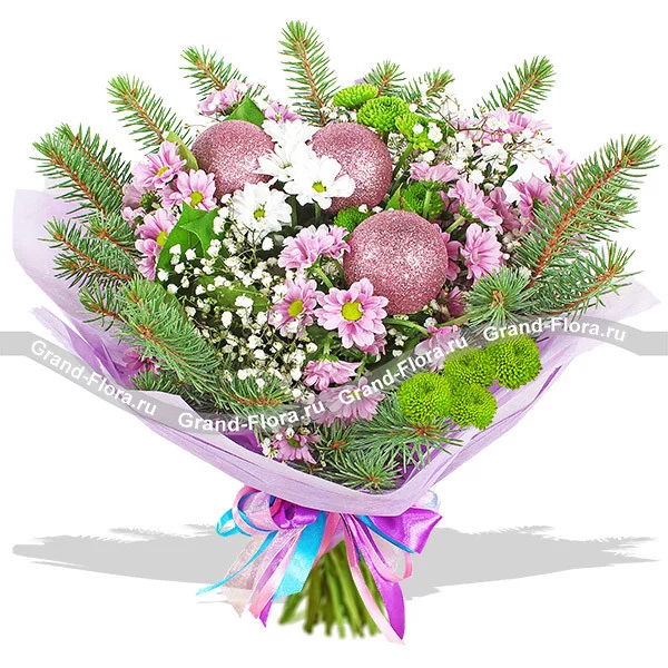 ДЕЛЮКС: хризантема белая ромашковидная - 6 шт., хризантема розовая ромашковидная - 8 шт., хризантема зеленая (сантини) - 6 шт., гипсофила - 7 шт., еловая ветвь, новогодний декор и зелень, фетр.