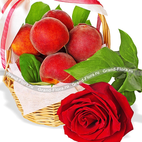 Стандартный: роза красная - 1 шт., рускус - 2 шт., персики - 1,5 кг, фетр розовый, корзина средняя, бант бело - красный.