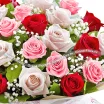 25 роз: роза красная - 9 шт., роза розовая - 8 шт., роза белая - 8 шт., гипсофила - 5 шт., салал - 5 шт., фетр белый, бант красный.