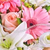 Утонченный микс состоит из элегантных розовых роз, пленительных белых эустом, шикарных лилий и альстромерий, а также из гербер в тон розам. Букет превосходно подойдет на подарок дорогой маме, а также любимой девушке в честь дня рождения.В довершении, можете преподнести его молодоженам в день свадьбы - они по достоинству оценят изящность композиции.