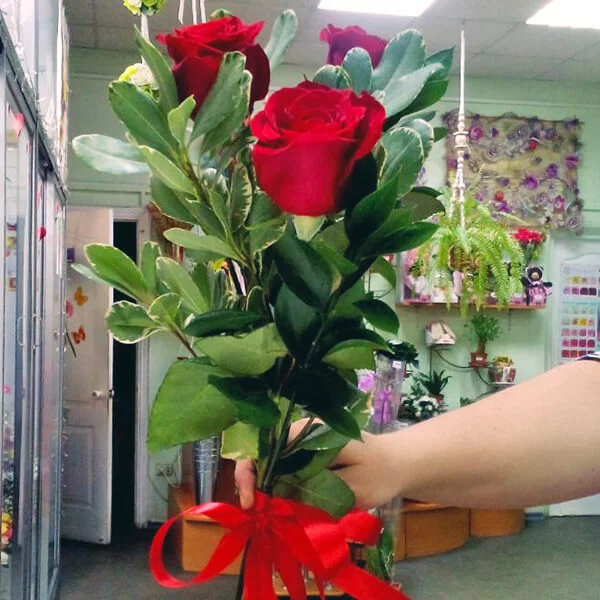Красивые розы и оформление зеленью без упаковки, как я и просила! Букет очень понравился маме и стал приятным сюрпризом в день ее рождения.
