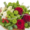 ДЕЛЮКС: роза красная - 9 шт., роза кустовая белая - 6 шт., хризантема кустовая зелёная 8 шт., аспидистра - 5 шт., эвкалипт - 4 шт., салал 4 шт., гиперикум - 5 шт., упаковка крафт, лента. Примерный размер: 45Х45см.