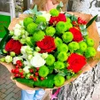 Уменьшенный: роза красная - 2 шт., роза кустовая белая - 1шт., хризантема кустовая зелёная - 1 шт., аспидистра - 1 шт., эвкалипт - 1 шт., салал - 2 шт., гиперикум - 1 шт., упаковка крафт, лента. Примерный размер: 20Х20 см.