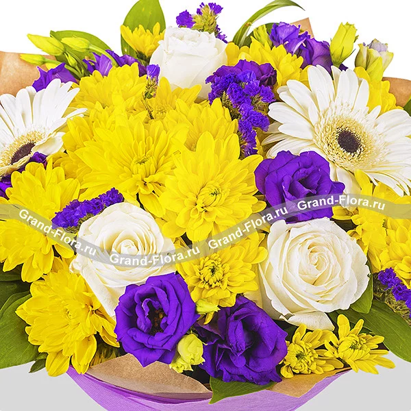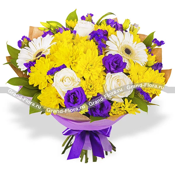 Стандартный: хризантема кустовая жёлтая - 3 шт., гербера белая - 2 шт., роза белая - 3 шт., эустома фиолетовая - 3 шт., статица фиолетовая - 2 шт., рускус - 3 шт., фиолетовый фетр., фиолетовая лента.