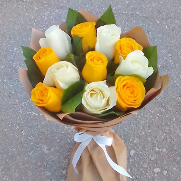11 роз: роза жёлтая - 6 шт., роза белая - 5 шт., питтоспорум, упаковка, лента.