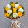 13 роз: роза жёлтая - 7 шт., роза белая - 6 шт., питтоспорум, упаковка, лента.