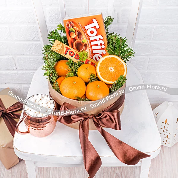 Стандартный: конфеты "Toffifee"- 250 г., шоколад "Tobleron" - 100 г., мандарины - 1 кг., апельсины - 3 шт., ель, коробка.