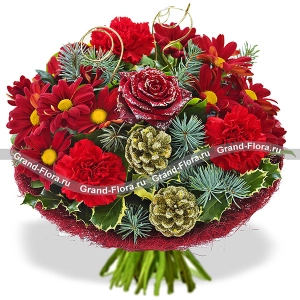 Стандартный(на фото): роза кустовая розовая - 7 шт., новогодние игрушки - 8 шт., ель, оазис, коробка.