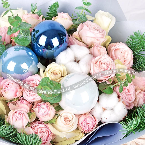 Cтандартный: роза белая - 5 шт., кустовая роза розовая - 4 шт., эвкалипт, хлопок, шарик - 3 шт., ель, упаковка, лента.