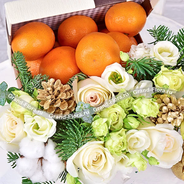 Стандартный: роза белая - 5 шт., эустома белая - 2 шт., роза кустовая белая - 1 шт.,ель, мандарины - 1 кг., шишки - 2 шт., оазис, коробка.