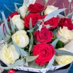 роза красная, белая - 19 шт.,  эвкалипт - 5 шт., упаковка, бант красный.