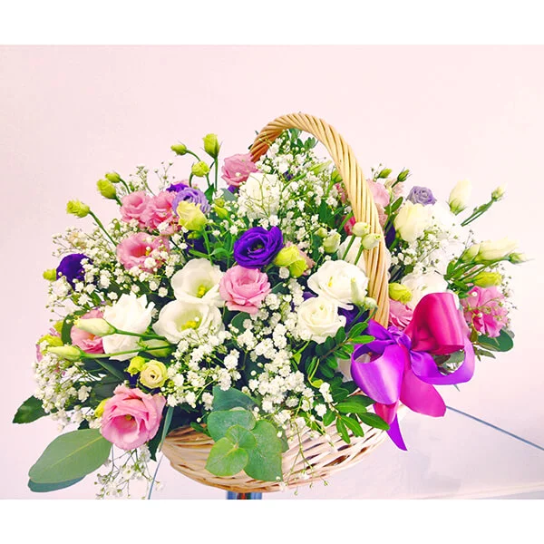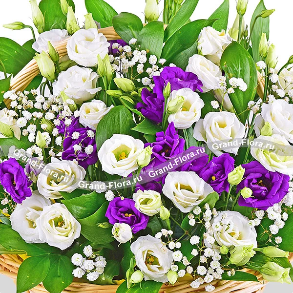 Нежное сочетание белых и сиреневых эустом выигрышно подчеркивает гипсофила и декоративная зелень. Букет, помещенный в изящную корзину, станет безупречным решением для вручения дорогому человеку на праздник.