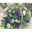 Люкс: эустома белая и сиреневая - 15 шт., гипсофила - 4 шт., декоративная зелень, оазис, корзина средняя. Примерный диаметр корзины 30х30 см.